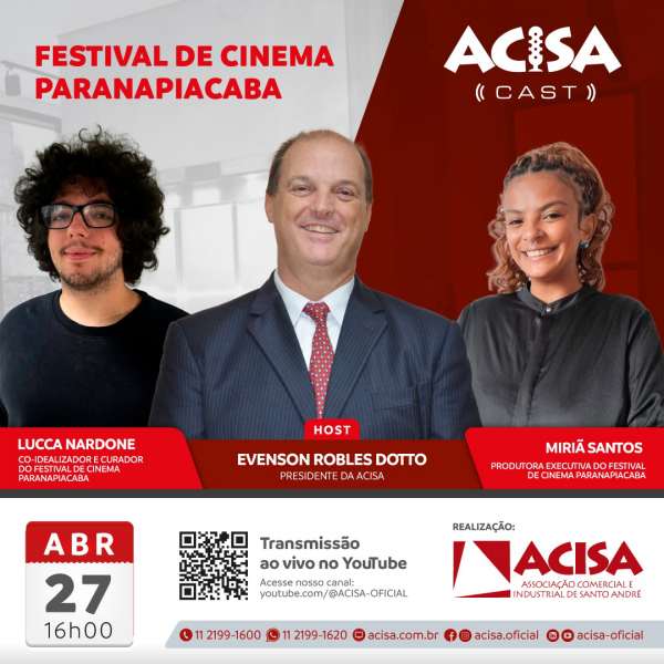 Apoio à cultura também faz parte da pauta da Associação Comercial e Industrial de Santo André – ACISA. Por isso, a próxima edição do ACISA Cast, na segunda-feira (27 de abril), às 16h, trará como tema o Festival de Cinema Paranapiacaba. Com apresentação do presidente Evenson Robles Dotto e transmissão ao vivo pelo canal oficial da entidade no YouTube (@ACISA-OFICIAL), o podcast contará com a presença dos coorganizadores do festival, Miriã Santos e Lucca Nardone.