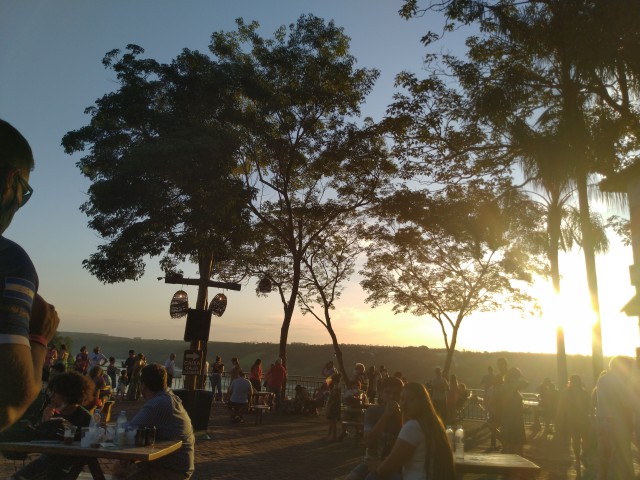Depois visitamos o marco das 3 fronteiras, um show de história e de cultura dos três países irmãos: Brasil/Paraguai/Argentina. Os três obeliscos, um de frente para o outro, cada um no seu território, separados pelos dois rios: Iguaçu e Paraná. Um pôr-do-sol lindo demais, ao som de músicas, danças e pessoas tagarelando.