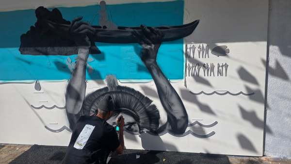 O mural apresenta um indígena gigante, com o rosto parcialmente submerso em ondas. De seus braços erguidos, ele sustenta uma pequena canoa com um garoto ribeirinho dentro — em posição de salto, como quem se lança ao desconhecido ou emerge de uma ancestralidade comum.