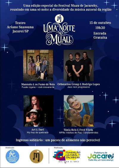 Desde 2019, o Festival Muau de Jacarehy tem se dedicado a valorizar e difundir a música autoral produzida em Jacareí e na região, abraçando artistas de todas as gerações e estilos musicais. Neste ano, o festival ganha uma edição especial em formato intimista: “Uma Noite no Muau”, reunindo em uma única noite diferentes vertentes da cena musical independente.
