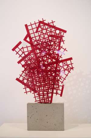 Alexandre Canonico (1974) introduz outra dimensão da transparência ao tornar visível o próprio fazer. Sua prática, situada entre arquitetura, escultura e desenho no espaço, utiliza materiais industrializados como madeira compensada, fios, metais e espumas para criar composições geométricas tensionadas. A transparência não está apenas nos materiais, mas na exposição das decisões, dos limites e dos gestos que constroem a obra.