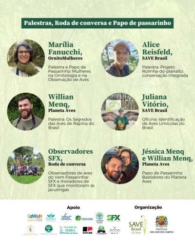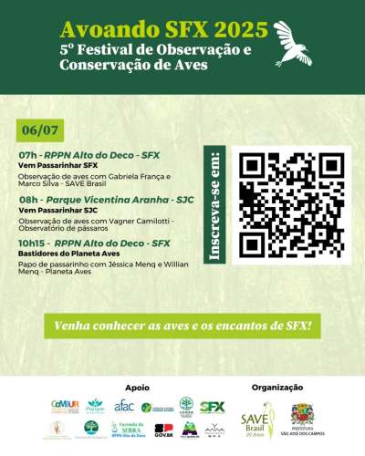Realizado desde 2021, o festival é parte de uma agenda permanente de conservação da região da Serra da Mantiqueira, reconhecida pela riqueza de sua fauna e flora. Em sua última edição, em junho de 2024, o evento mobilizou cerca de 170 participantes entre moradores, turistas, especialistas e educadores. “O Avoando SFX oferece uma experiência de imersão que conecta ciência, cultura e natureza. É uma oportunidade de gerar conhecimento e engajamento, especialmente com a população local, para a proteção das aves e dos ecossistemas que nos cercam”, afirma Alecsandra Tassoni, coordenadora de projetos da SAVE Brasil.