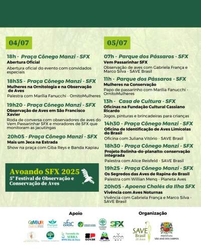 De 4 a 6 de julho, o distrito de São Francisco Xavier, em São José dos Campos (SP), sediará o 5º Avoando SFX – Festival de Observação e Conservação de Aves, iniciativa gratuita que busca aproximar a população das ações de preservação da biodiversidade. Promovido pela Prefeitura de São José dos Campos em parceria com a SAVE Brasil, o evento será realizado na Praça Cônego Manzi e contará com observações de aves, oficinas, exposições, palestras e atividades culturais. O objetivo é fortalecer o vínculo entre sociedade e meio ambiente, ao mesmo tempo em que estimula o turismo ecológico e a economia local.