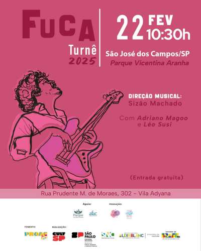 Fuca é um contrabaixista, morador de Ubatuba, compositor e arranjador de música instrumental brasileira e autoral. Em circulação no estado de São Paulo pelo ProAc, acompanhado de Leo Susi na bateria e Adriano Magoo no piano, o Fuca Trio já fez shows em Campinas, Caraguatatuba, São Sebastião, Taubaté, Jacareí, Santos e Limeira e agora chega a São José dos Campos. O oitavo, dos dez shows dessa turnê, acontece no dia 22 de fevereiro, domingo, no Parque Vicentina Aranha, às 10h30. A entrada é gratuita.