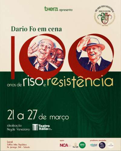 Um convite vindo da Itália, direto da Fondazione Fo Rame, para comemorar, ao lado de outros países, o centenário de nascimento do dramaturgo Dario Fo (1926-2016) acendeu em NEYDE VENEZIANO o desejo de criar um evento e celebrar o artista que fez do palco espaço de crítica social, humor irreverente e resistência cultural. Uma honra para a diretora receber esta reverência da fundação que preserva a memória dos dois artistas italianos e que comemora a data com 100 espetáculos pelo mundo (100 annidi Dario Fo, 100 spettacolinel mondo!, como informa o site da organização). Pesquisadora da obra de Fo e autoridade no assunto aqui no Brasil, tendo convivido com o vencedor do Prêmio Nobel de Literatura de 1997 e também com sua companheira, a atriz Franca Rame (1929- 2013), em Milão, na época de seu pós-doutorado, ela logo convidou o ator e gestor do Teatro Itália, Marcus Veríssimo para conceber com ela essa empreitada. “Veneziano e Veríssimo, somos dois ítalo-brasiliani”, fala Neyde. “E não haveria melhor teatro para receber o projeto que o Itália, instalado no icônico Edifício Itália, cujo nome oficial é Circolo Italiano, na avenida Ipiranga, um dos marcos da cidade, tombado pelo Patrimônio Histórico e que abriga também o restaurante no seu topo, o Terraço Itália, que permite uma vista em 360 graus da cidade.” A ideia ganhou corpo, a ela juntaram-se pesquisadores, artistas e educadores e o projeto 100 Anos de Riso e Resistência– Dario Fo em Cenas será realizado na semana do aniversário (24/3) do dramaturgo, de 21 a 27 de março, no Teatro Itália, em São Paulo.