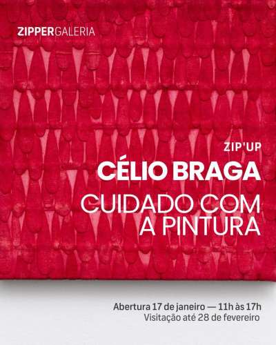A Zipper Galeria abre seu calendário expositivo de 2026 com a individual Cuidado com a Pintura, do artista plástico mineiro Célio Braga. Com curadoria de Celso Fioravante, a exposição reúne 21 obras em pequenos formatos (entre 30 × 20 cm e 45 × 40 cm). Neste conjunto inédito, o artista desloca a pintura de uma lógica centrada na imagem para um campo de construção material, no qual superfície, costura, camadas e volumes passam a integrar um mesmo sistema. Com inauguração marcada para o dia 17 de janeiro, a mostra integra o projeto Zip’Up, voltado a processos autorais e curadorias experimentais, realizado no andar superior da galeria.